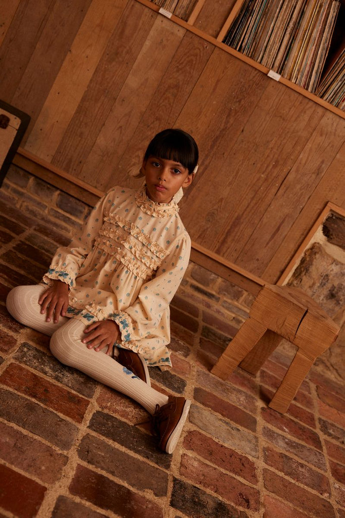Pernille is the prettiest new dress in the season’s ‘meadow calico’ rustic cotton-linen. With sweet ruffles trimming the neckline, chest, cuffs and hem, we love Pernille’s 1960s mood for parties and special occasions. Featuring sweet floral embroideries at cuffs and hemline. Button through closure at back. We love her worn with boat shoes for an effortlessly elevated look.