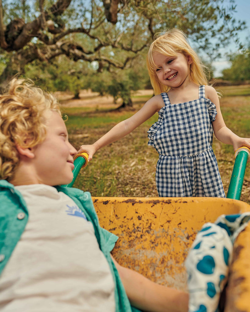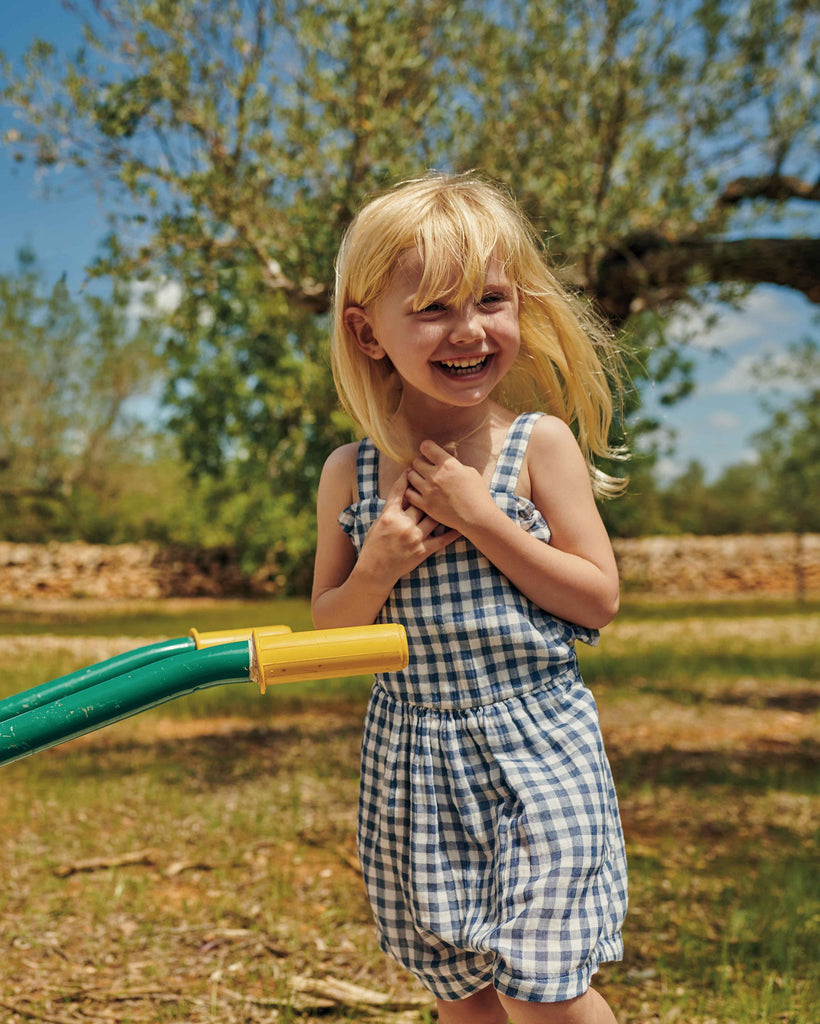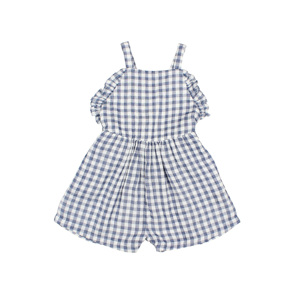 Short gingham muslin jumpsuit with straps adjustable on the back. Elastic band on the back and ruffle details on top.