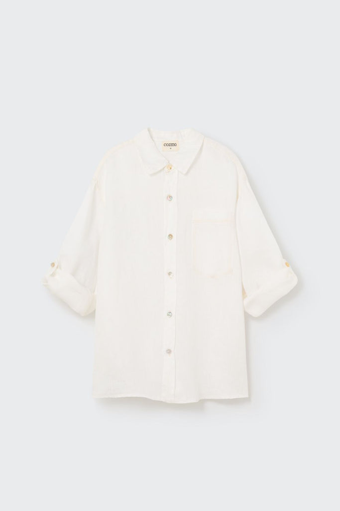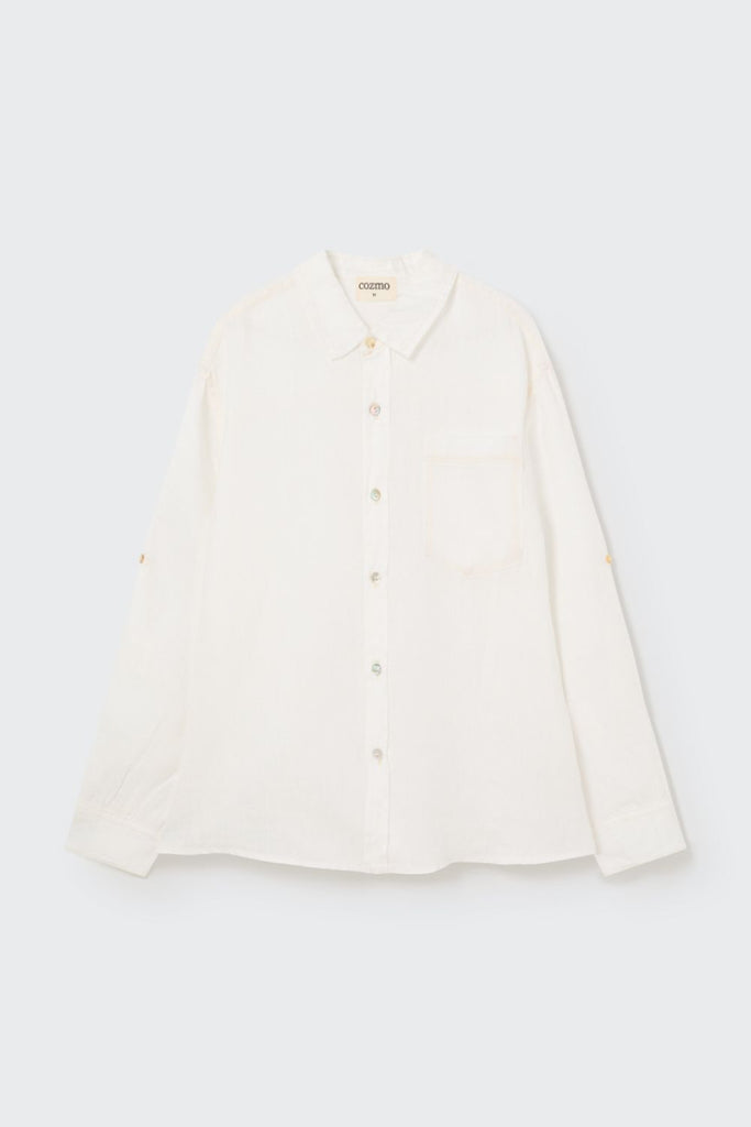 Long sleeve linen shirt with chest pocket and wooden buttons.