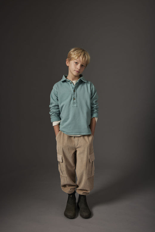 Wide corduroy cargo pants with adjustable braided drawstring, belt loops and side pockets. Contrasting cargo pockets.