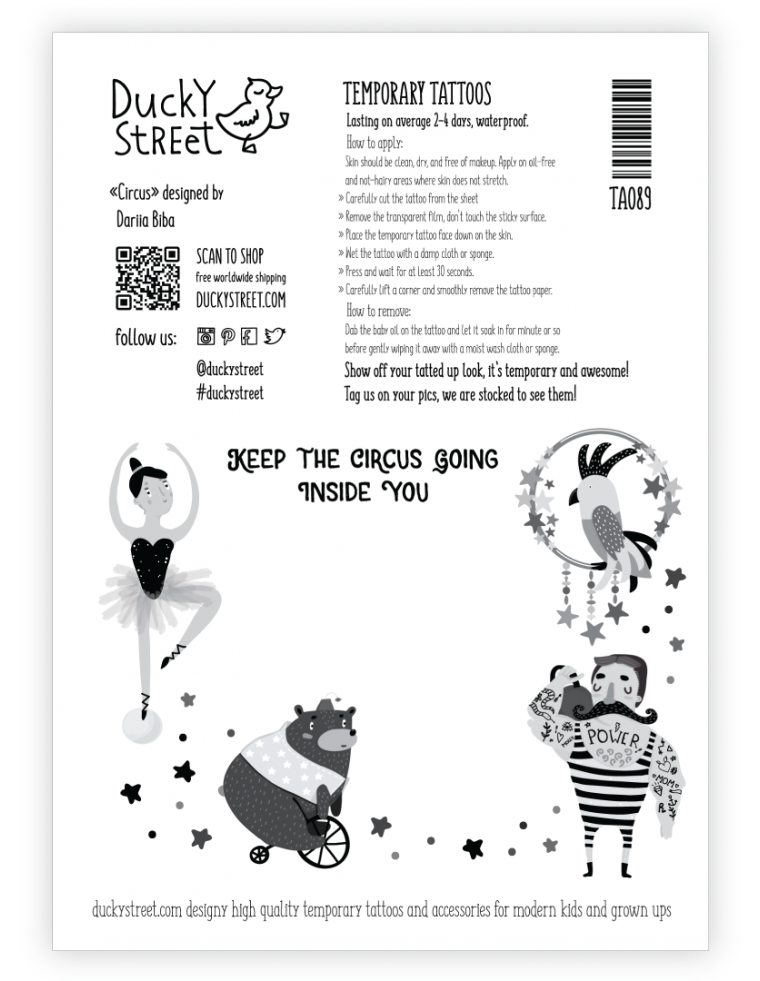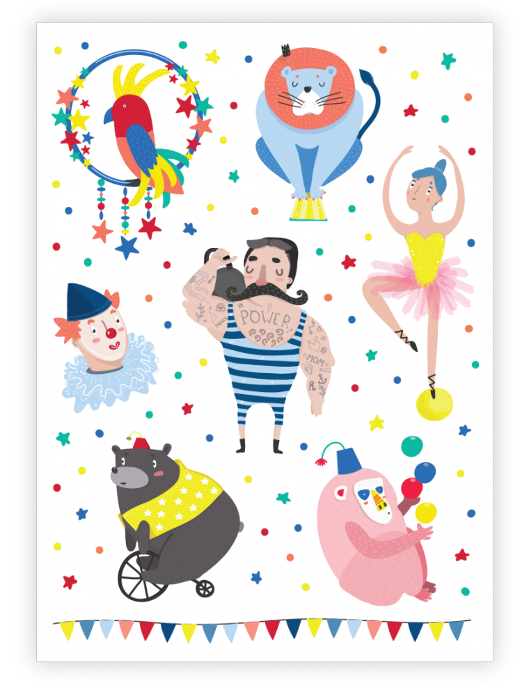 Tattoo set Circus comes with note section to write your own message on the tattoo back paper, so you can use it as Circus style greeting card, Funfair birthday party invitation or "Keep the circus inside you" thank you card.