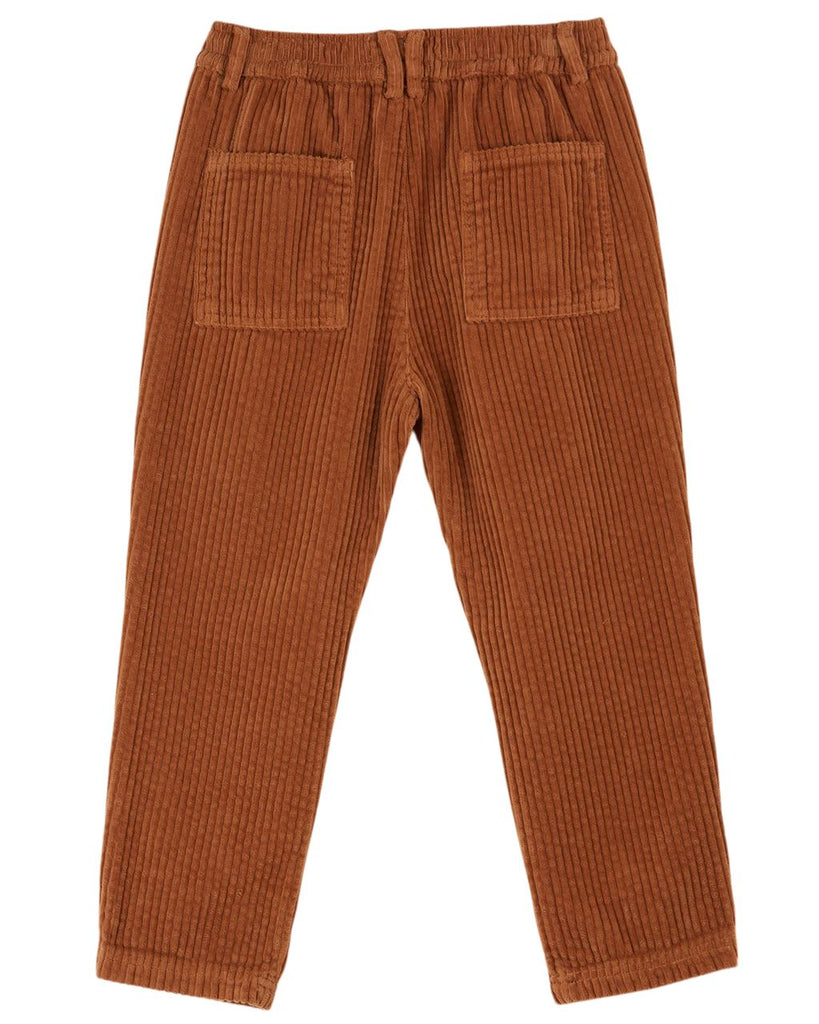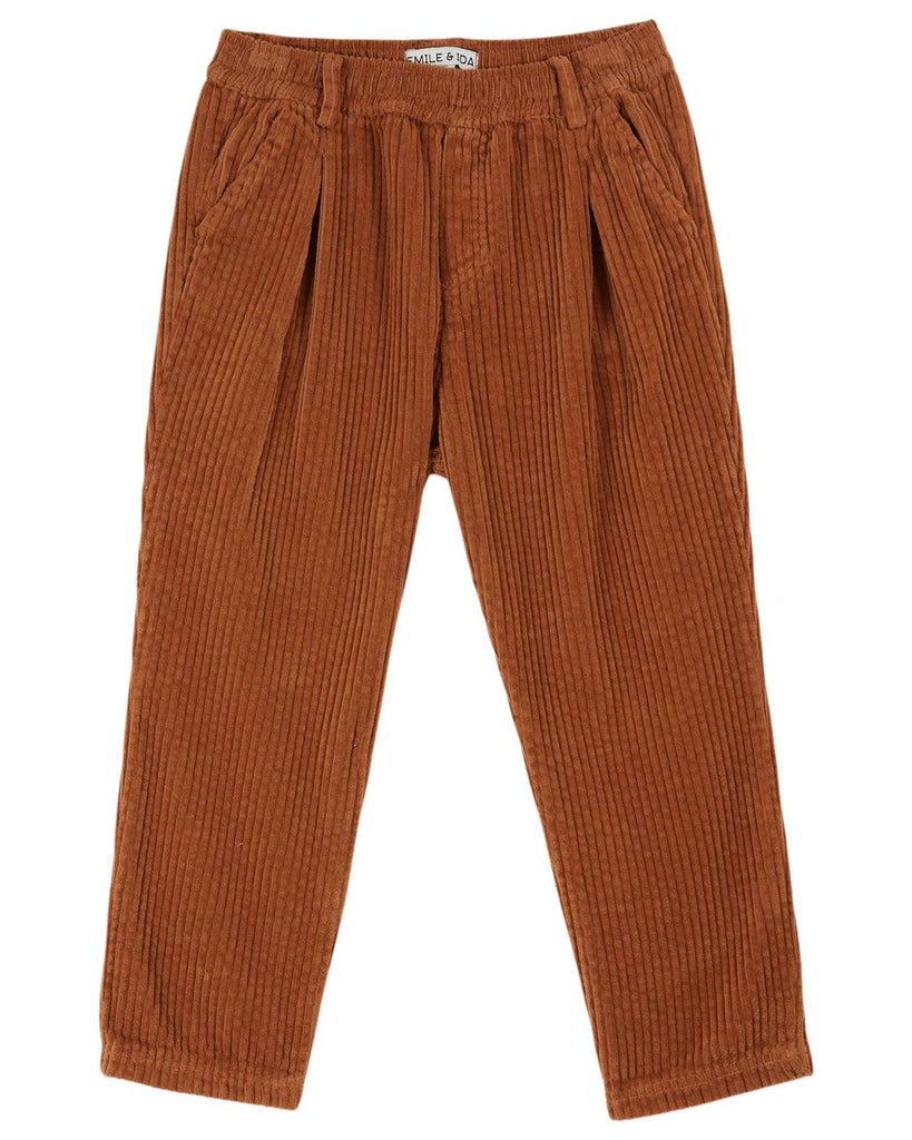 Pleated cotton corduroy pants with front and back pockets. Elastic waistband with belt loops.