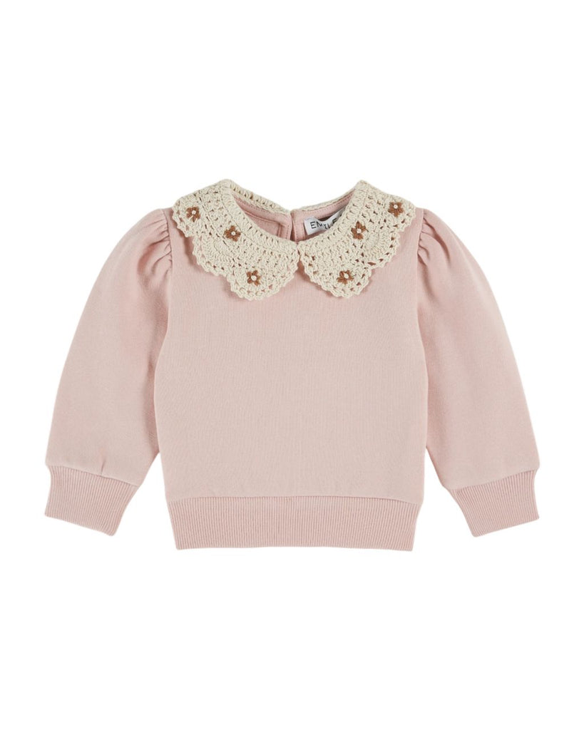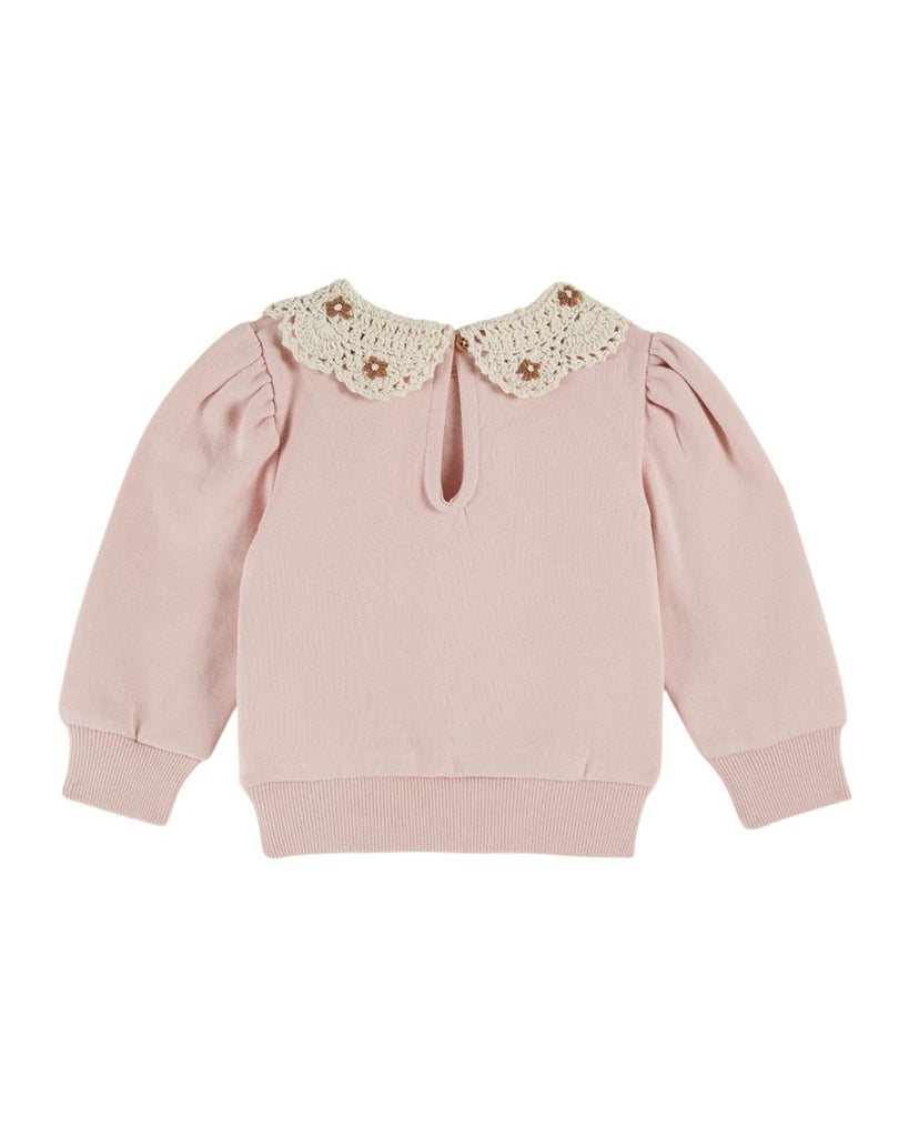 Sweatshirt in pink with a delicate crochet collar with embroidered detail. Closes at back with one mother-of-pearl button. Puff sleeves