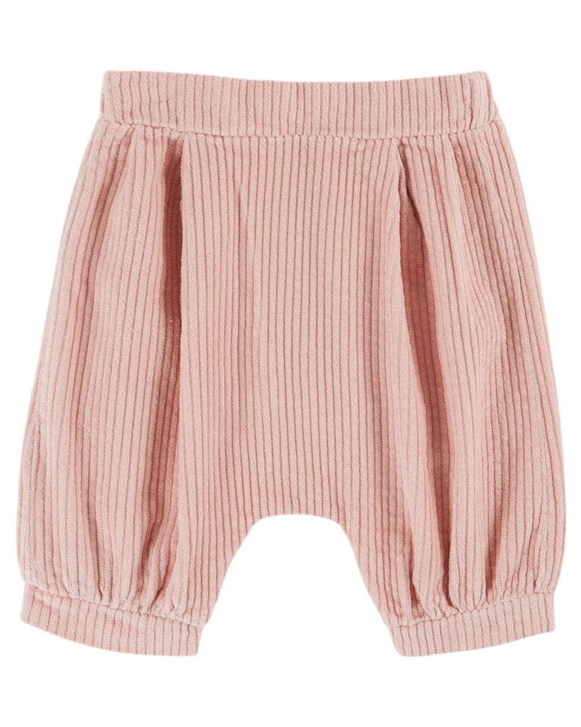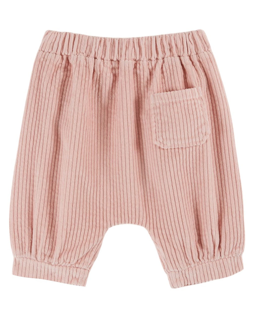Harem style corduroy baby pants with elastic waist. Pleated front and back pocket.