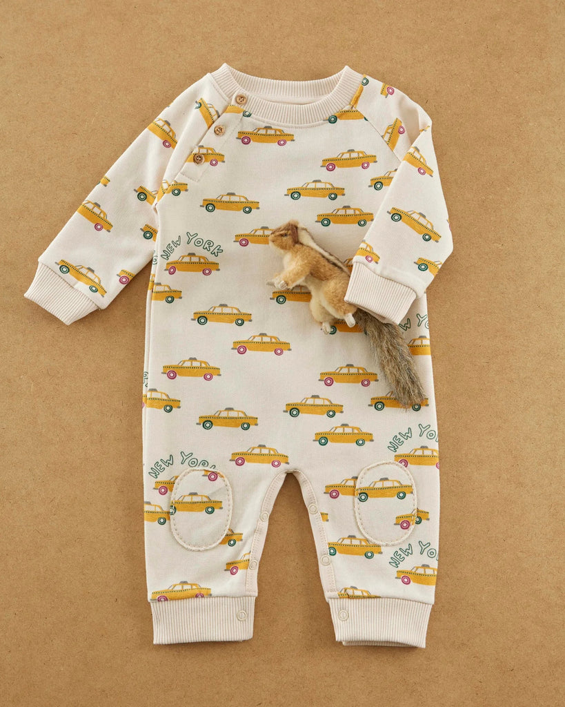 Velour jumpsuit in ecru color with all-over yellow New York cabs. Buttoned opening in sleeve raglan and snaps between the legs for easy changing.