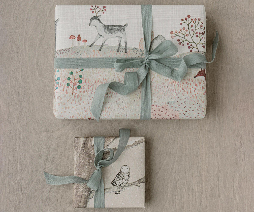 The decoration on this gift wrap started with Dorthe Mailil's hand painted drawings. After a graphical process, the giftwrap got a beautiful expression and the atmosphere of Christmas is complete. Add a beautiful soft ribbon as final touch.