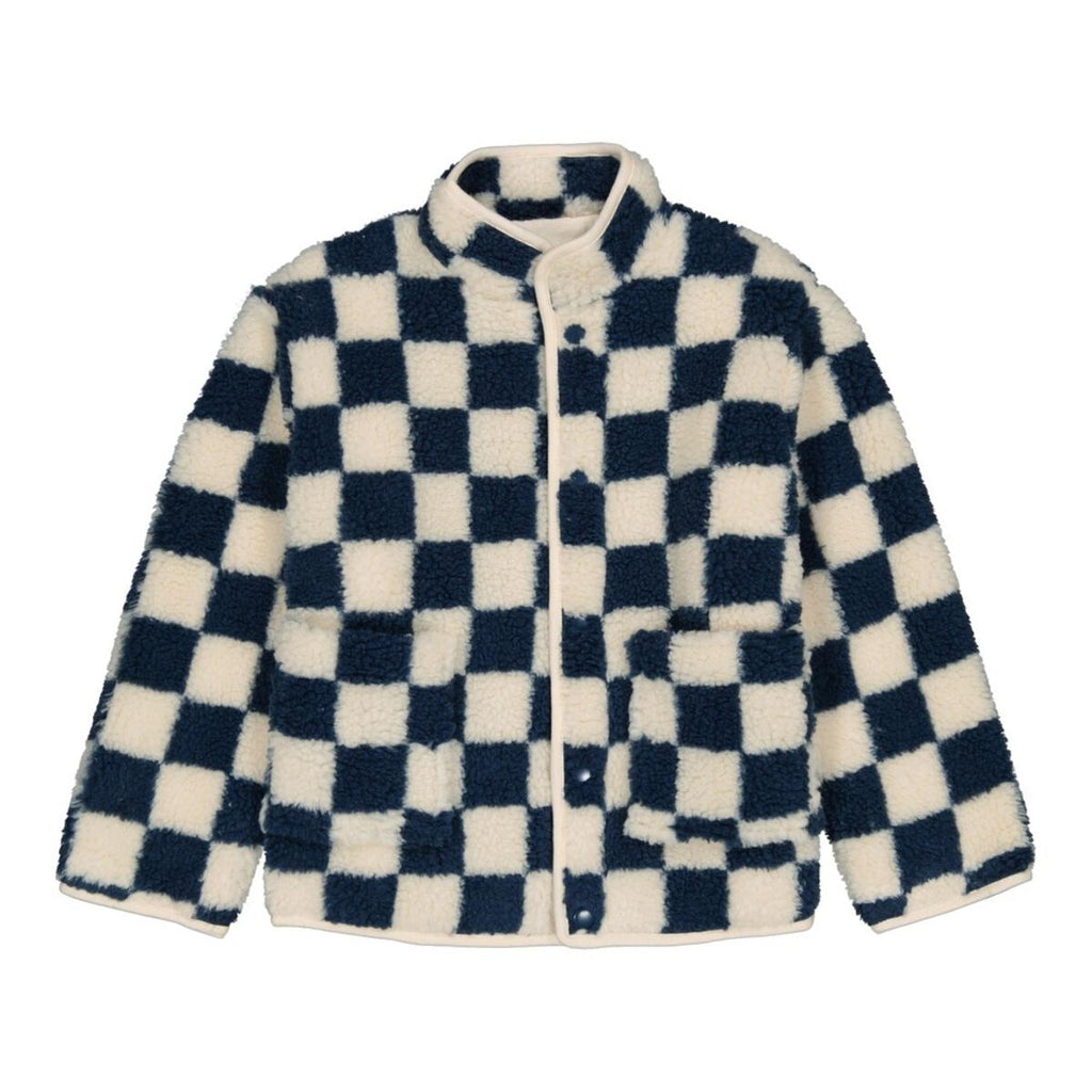 Warm fleece jacket in blue and ecru checks. Features turtleneck collar and two front pockets. Lining in cotton Closure with snap buttons.