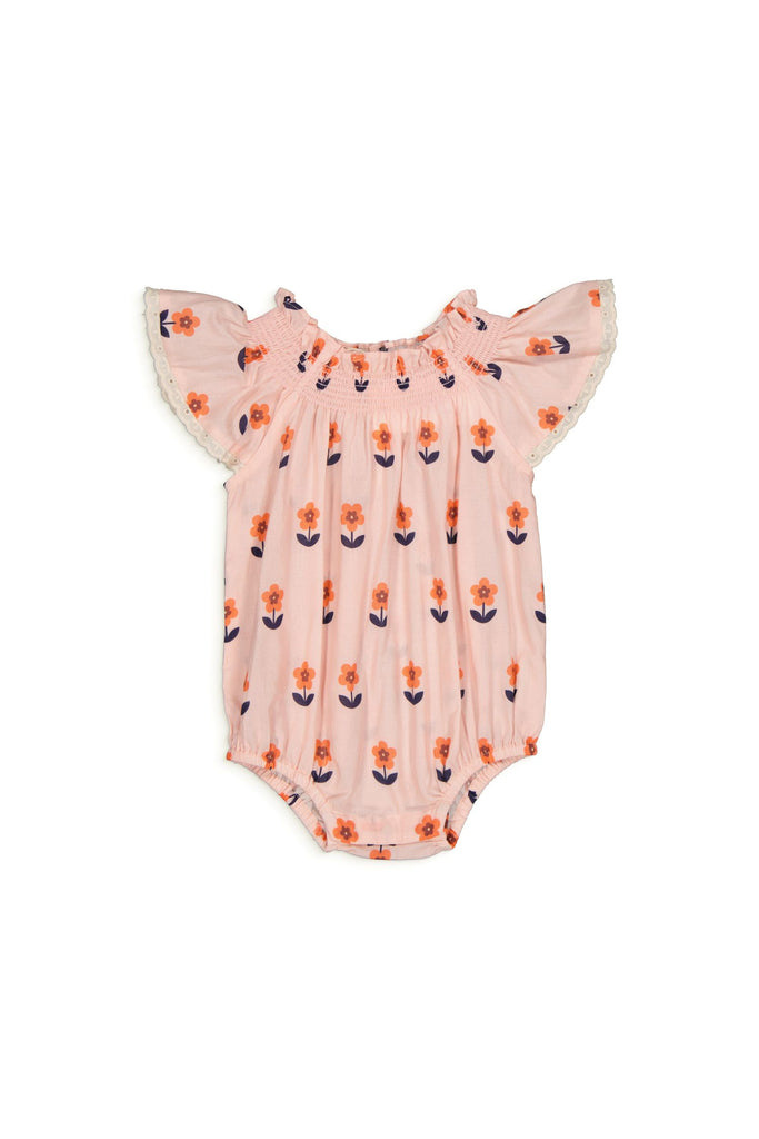 All over printed voile romper with rounded smocks around neckline. Ruffled short sleeves with English embroidery at bottom. Small fabric ruffle at neckline. Snap fastening at crotch.