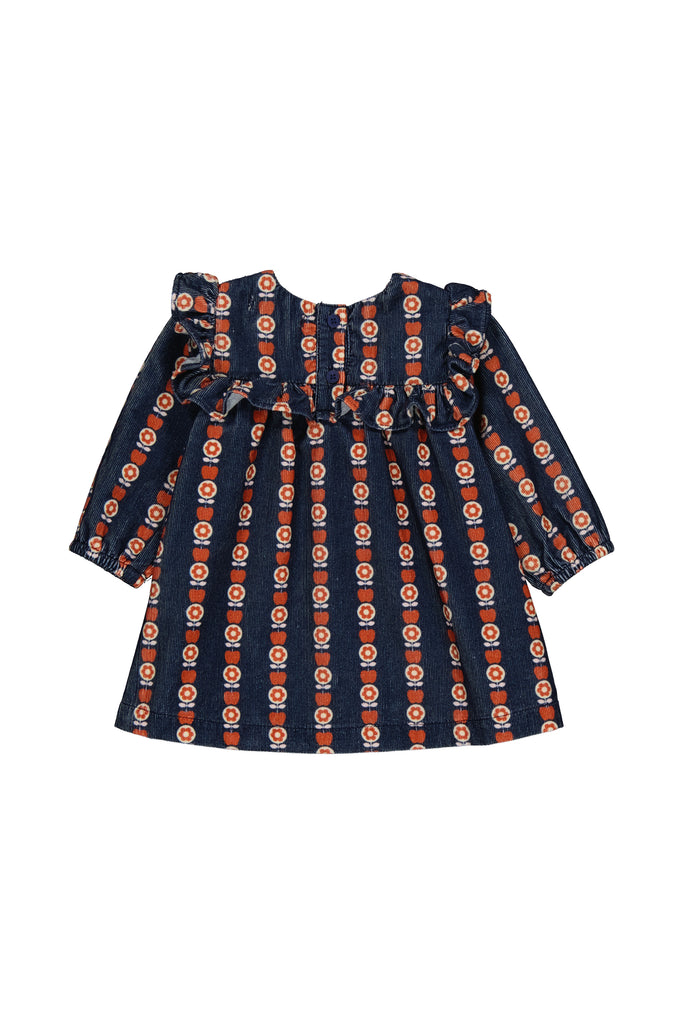Baby dress in all over printed corduroy cotton with English embroidery on the front,
