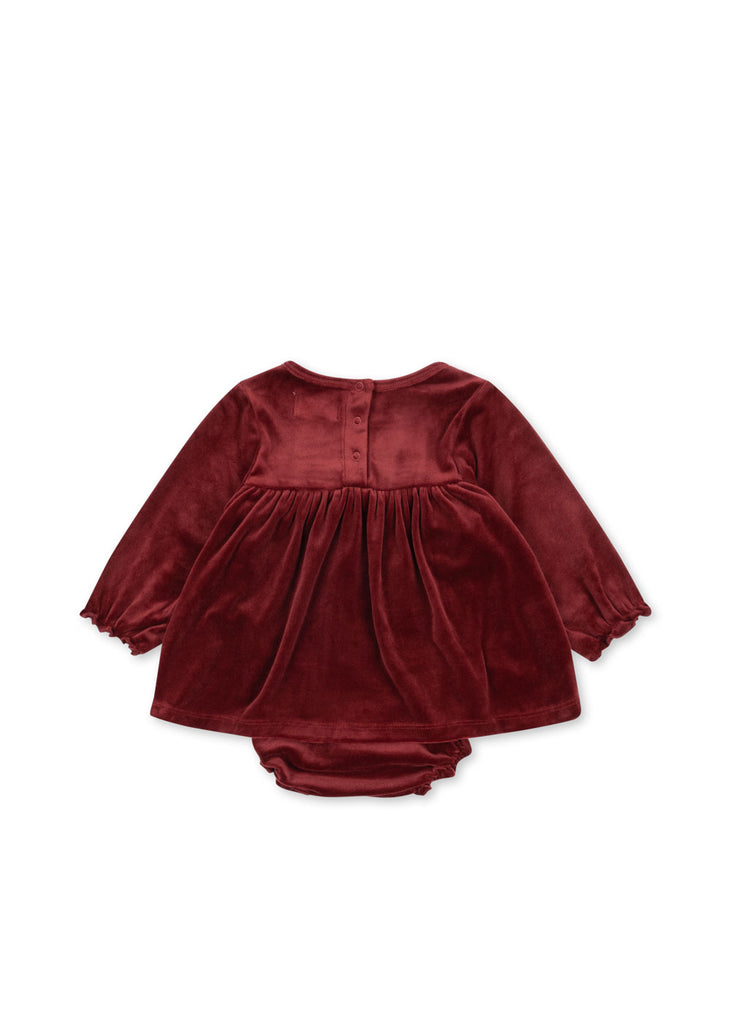 Holiday romper dress in a soft velvet quality. Designed with push buttons at leg opening for easy dressing.