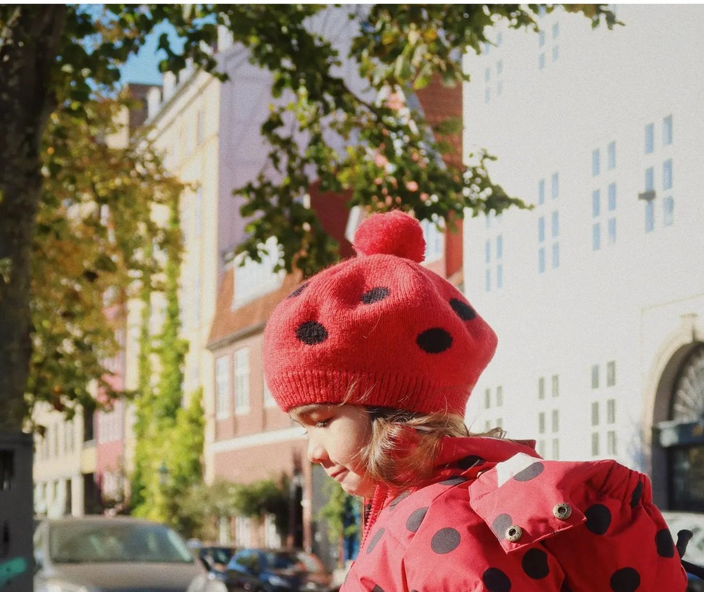 Classic beret in a breathable and warm wool quality with a fluffy pom-pom on top. Designed like a little ladybug with black spots on a fiery red.