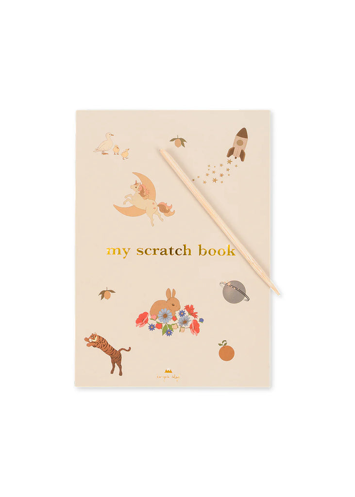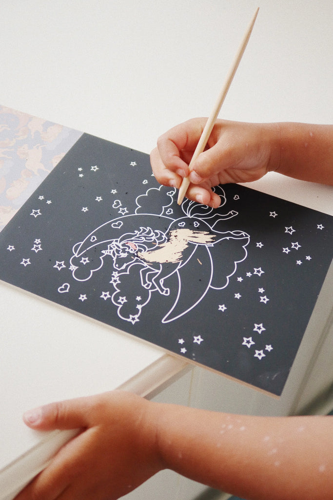 Scratch book set containing a bamboo pen for scratching and 15 scratch drawings.