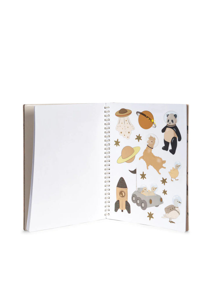 Fun sticker book with reusable stickers. Includes 8 different board pages with different worlds and universes. Create your own with the different stickers.