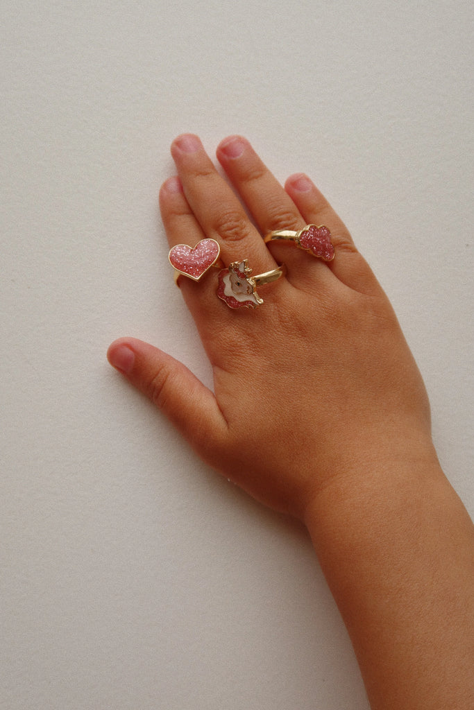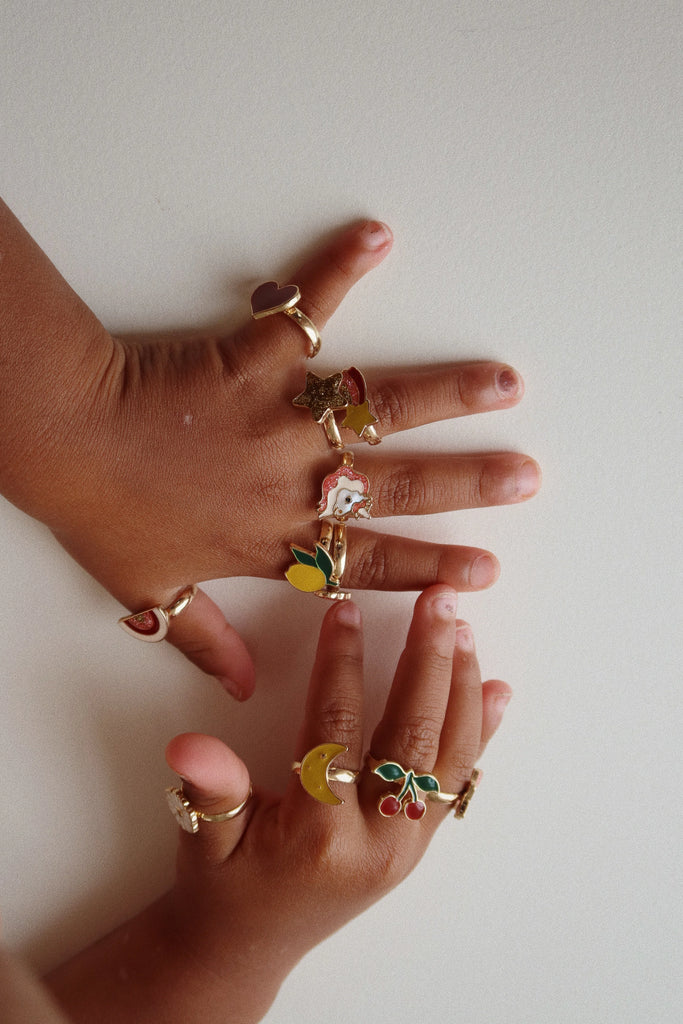 Set od 12 adjustable rings with decorative motifs. Made for tiny fingers.