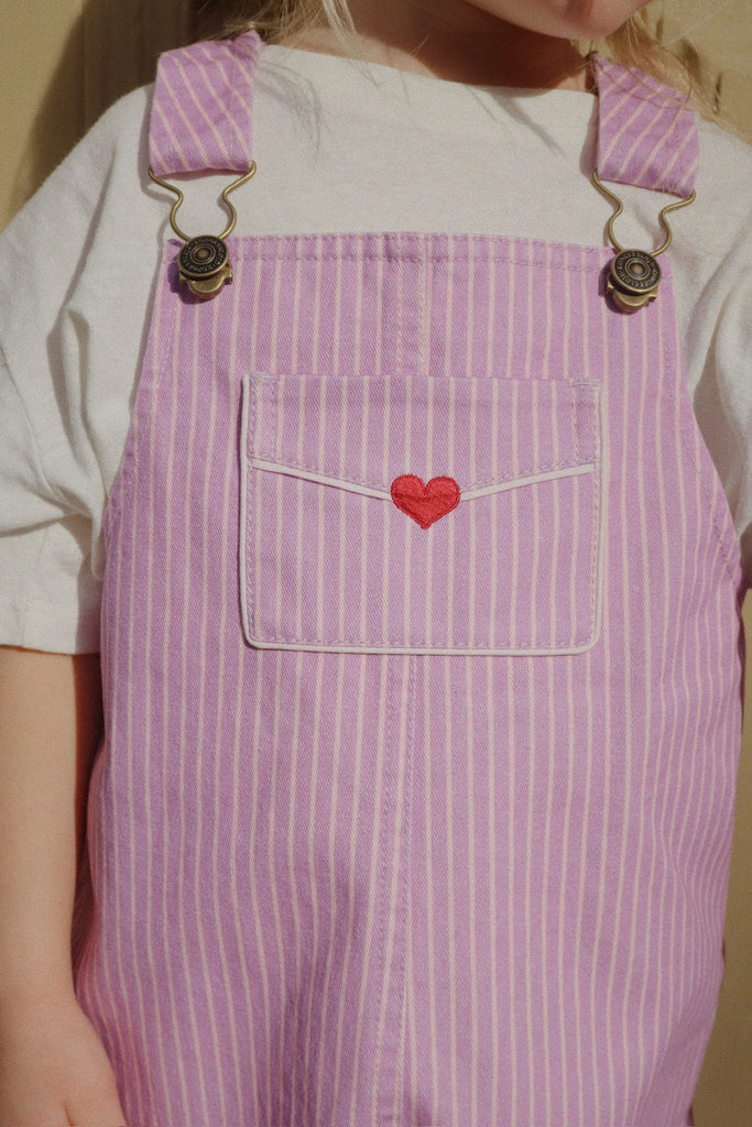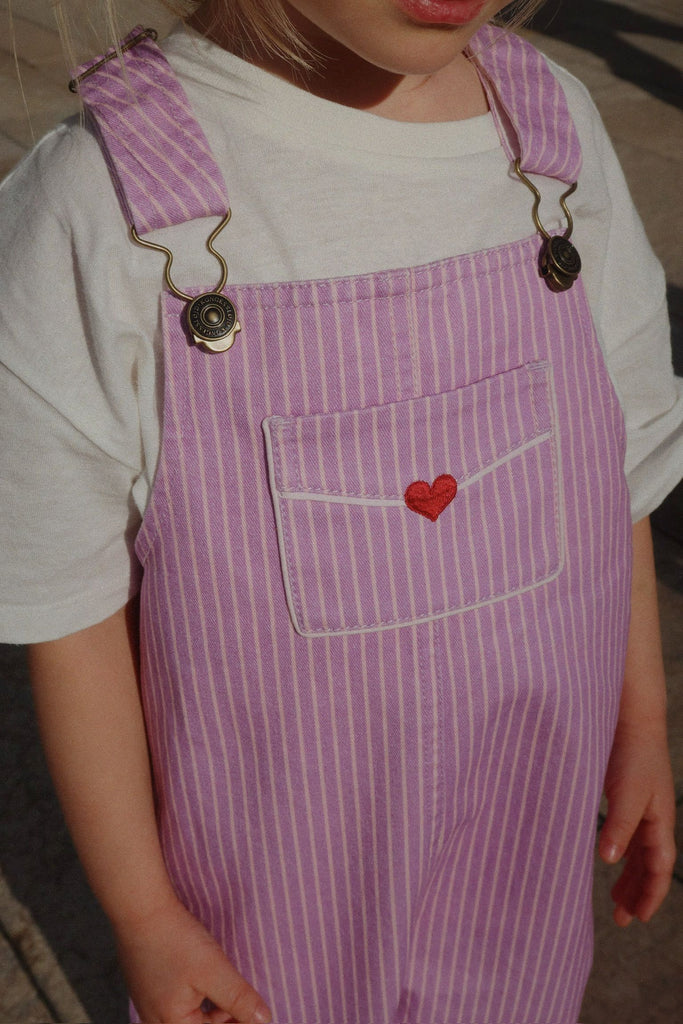 Overalls made in soft organic cotton twill with a decorative front pocket that is shaped like a love letter and stamped with a heart.
