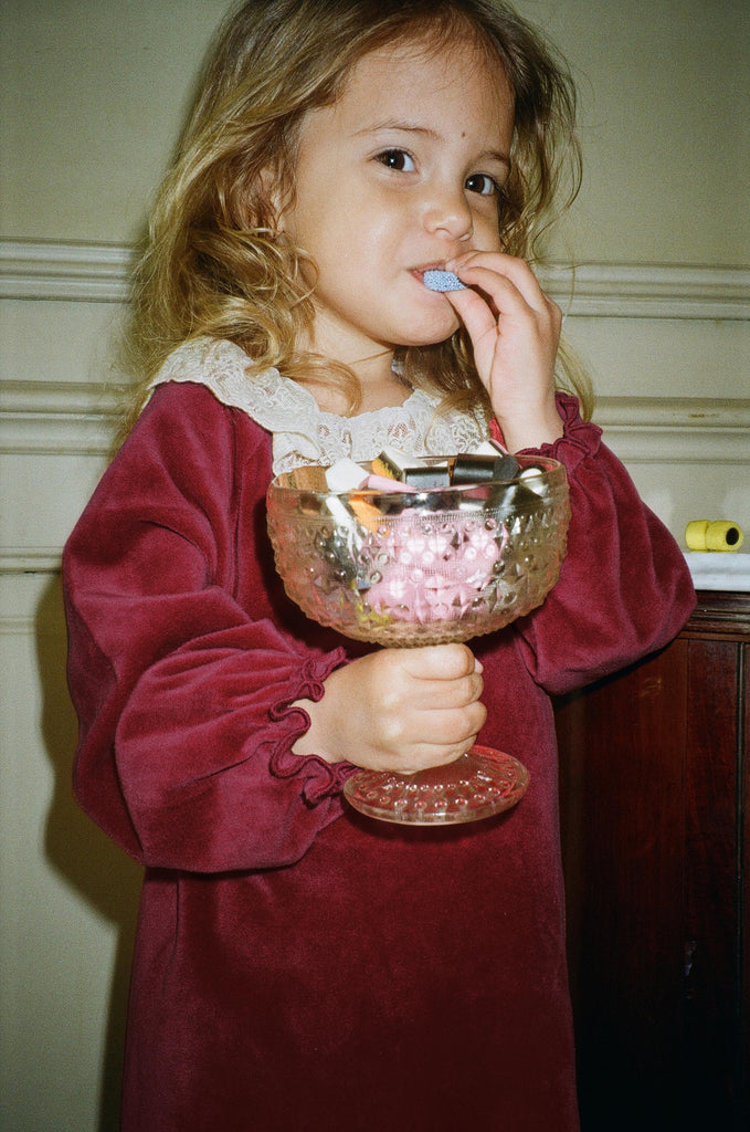 Soft velvet dress with a decorative lace collar. Loose, slightly a-shaped silhouette.