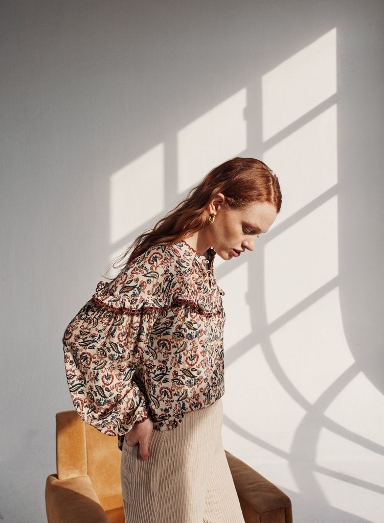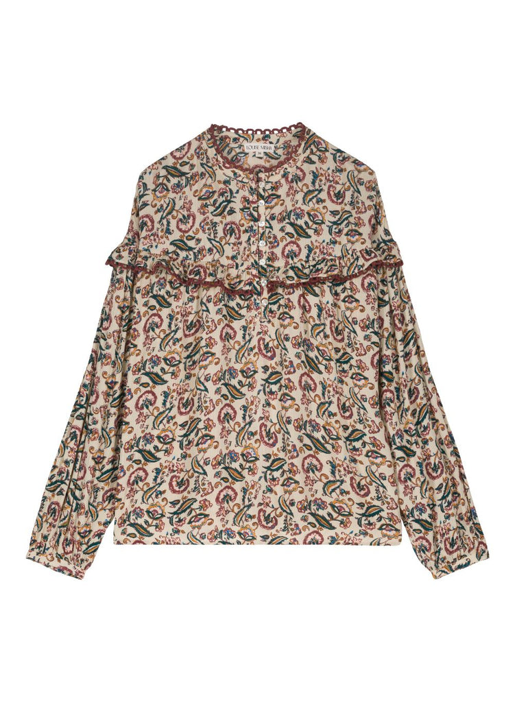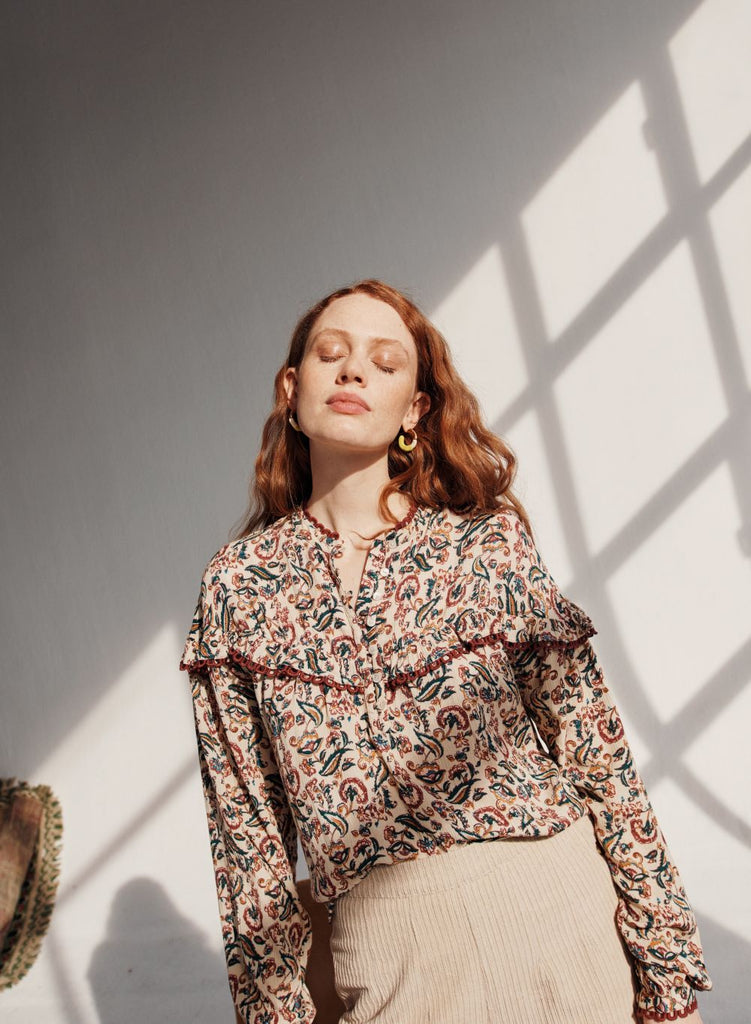 Round neck blouse with contrasted rickrack lace details on the collar, front ruffles, sleeves and at the back. Features an edge to edge covered placket with mother-of-pearl buckles and buttons, gathers under the ruffle at the front. Shirt cuffs with button.