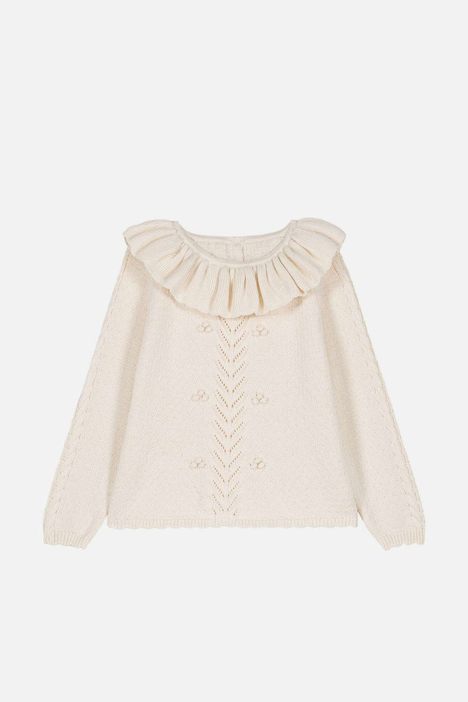 Solid color knit sweater with decorative stitches with Oversized ruffled Pierrot collar. Openwork twist at front with pompom detailing, twisted details on the sleeves and scalloped edges at the cuffs and lower hem. Button placket at the back.