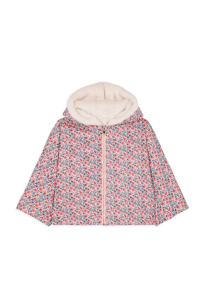 Hooded coat with allover flower print on one side and faux fur in cream inside. Front zipper and pockets.