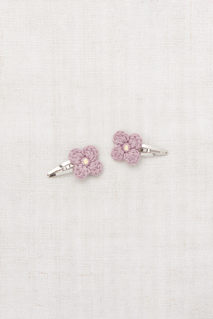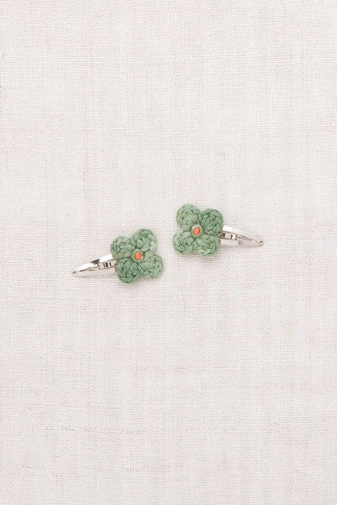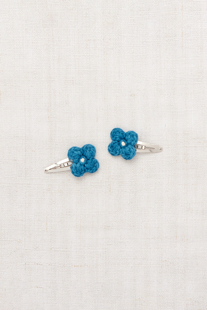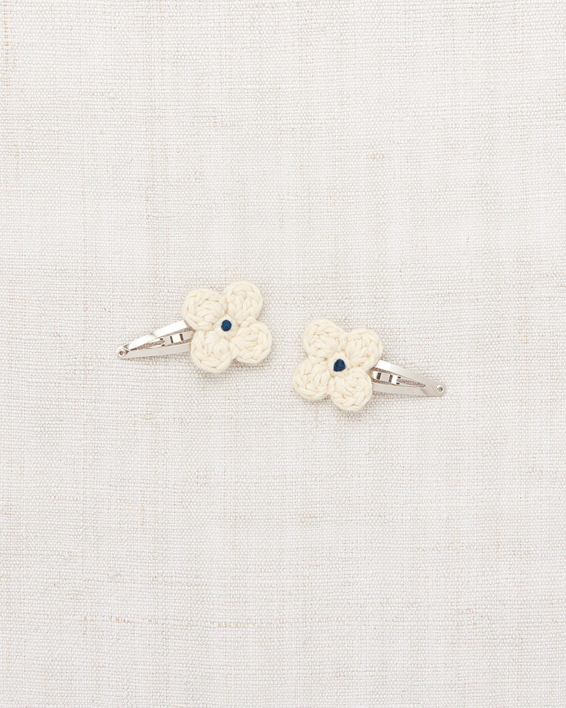 A two-color hand-crocheted flower set on snap clips — an effortless pop of charm for any look.