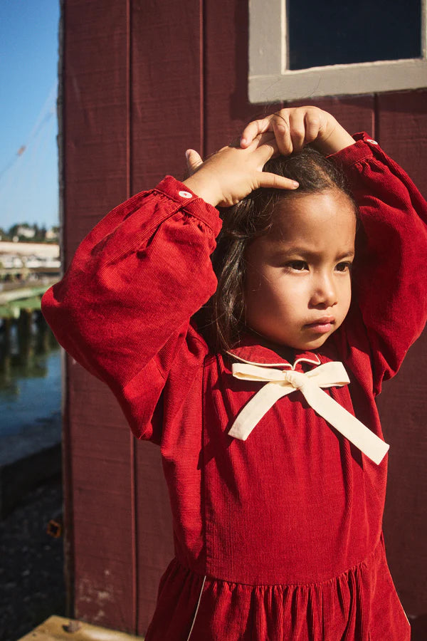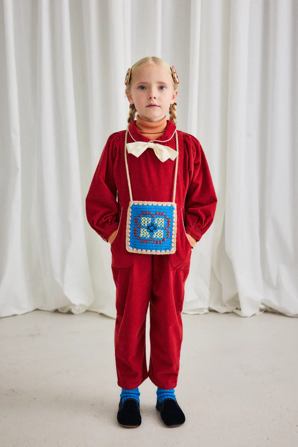 A jumpsuit in fine wale cotton corduroy that lends itself to a nice drape. Featuring mid-length blouson sleeves, a rounded collar with contrast trim, gathered waist, loose tapered legs with patch pockets and contrast trim, and a bow at the center front.