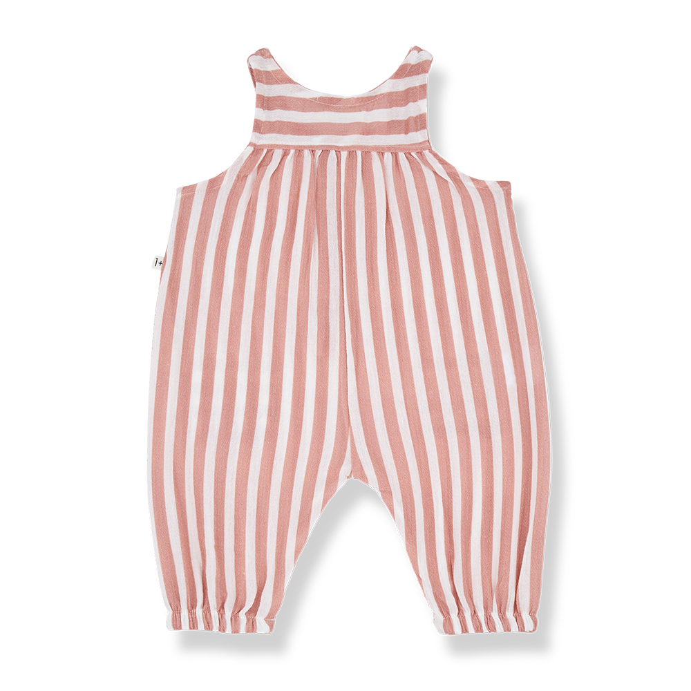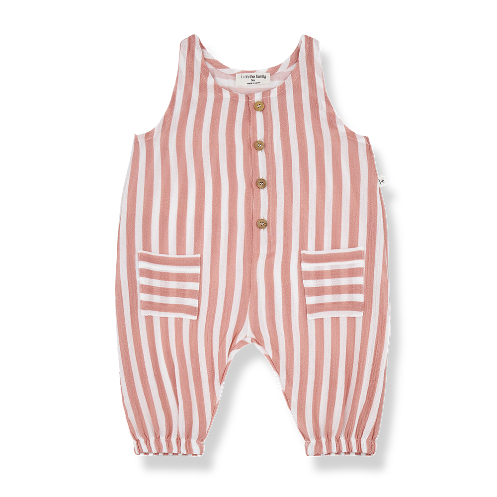 Sleeveless overall with front opening with wood buttons. Patch pockets on front and soft elastic hems.