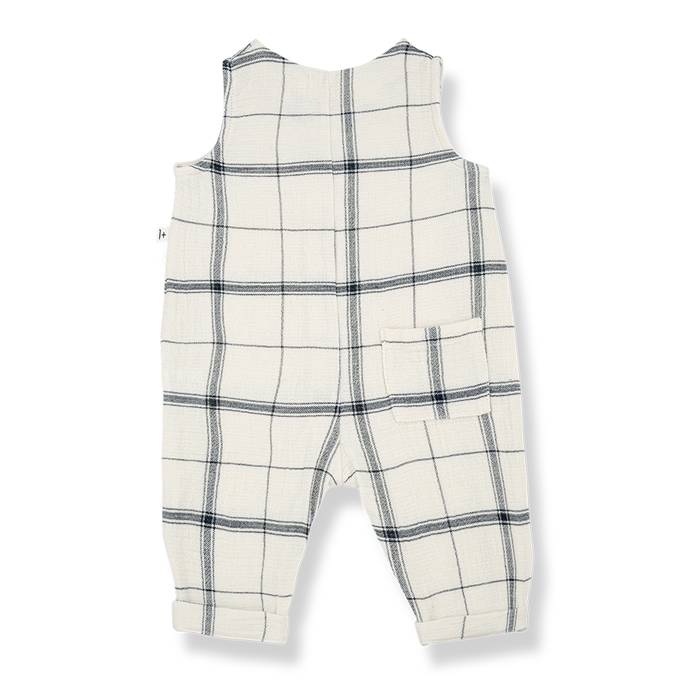 Sleeveless overall with front wooden buttons and back patch pockets.