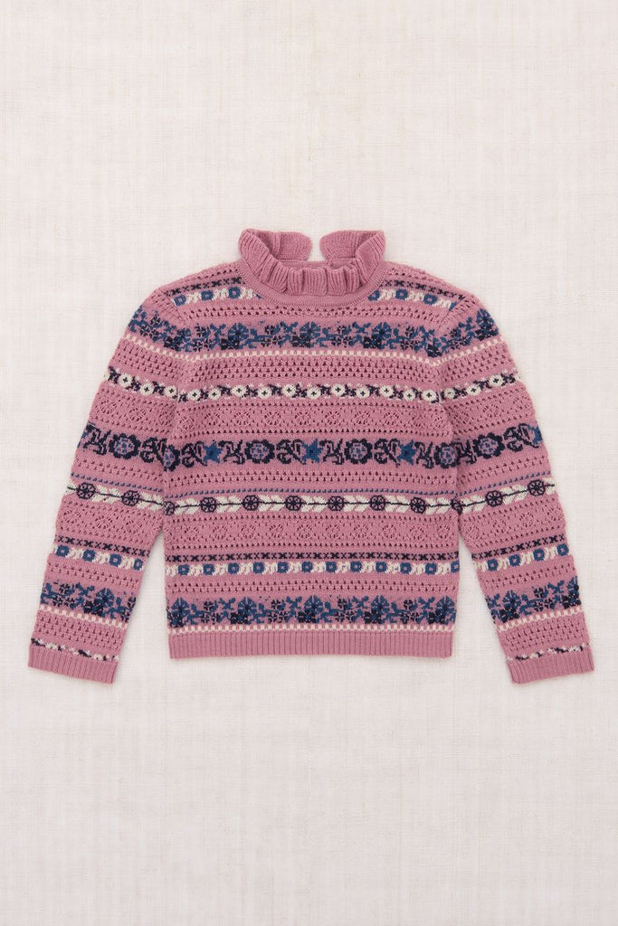 A long-sleeved top in a graphic fine-gauge Merino wool knit, featuring a ruffle turtleneck, alternating eyelet accents, ribbed trim, and a back placket with horn button closure.