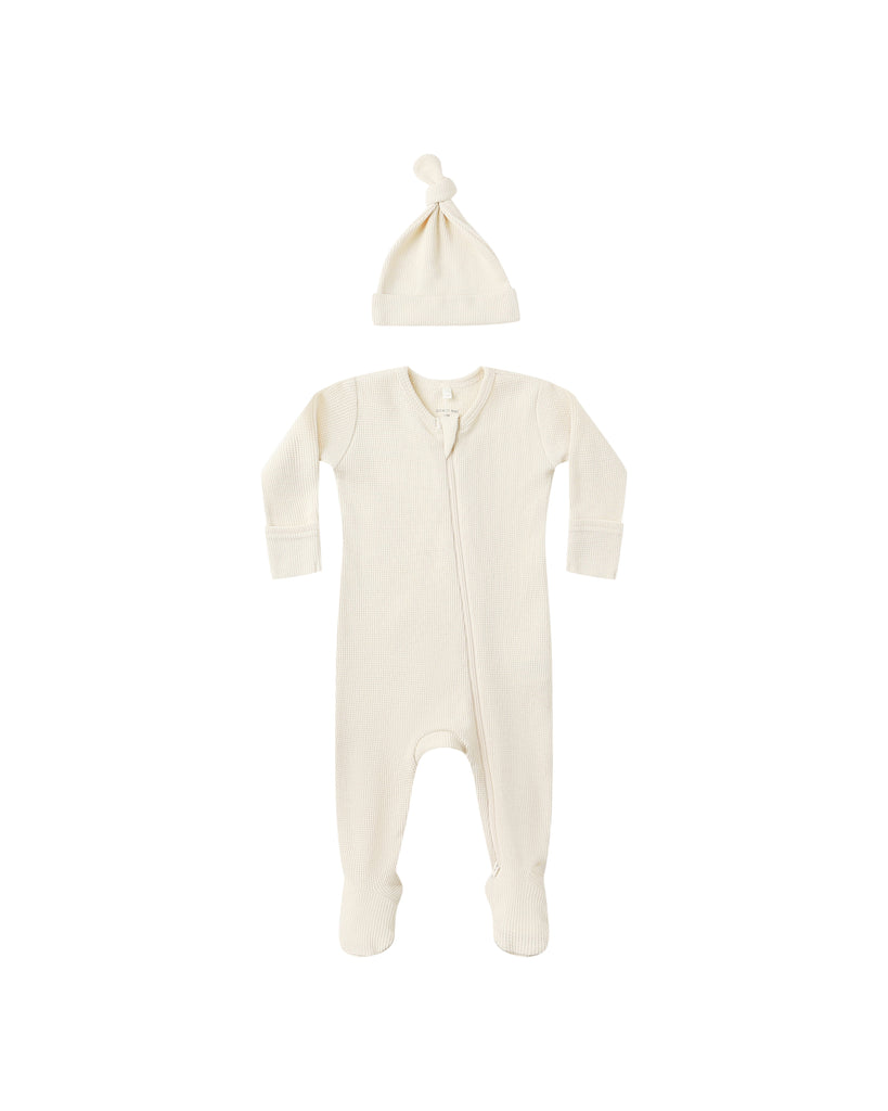 Set of full zip footie with longs sleeves in soft and stretchy fleece fabric, and matching beanie.