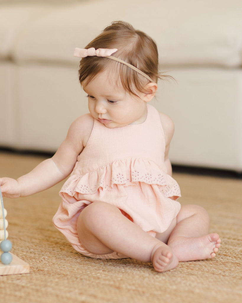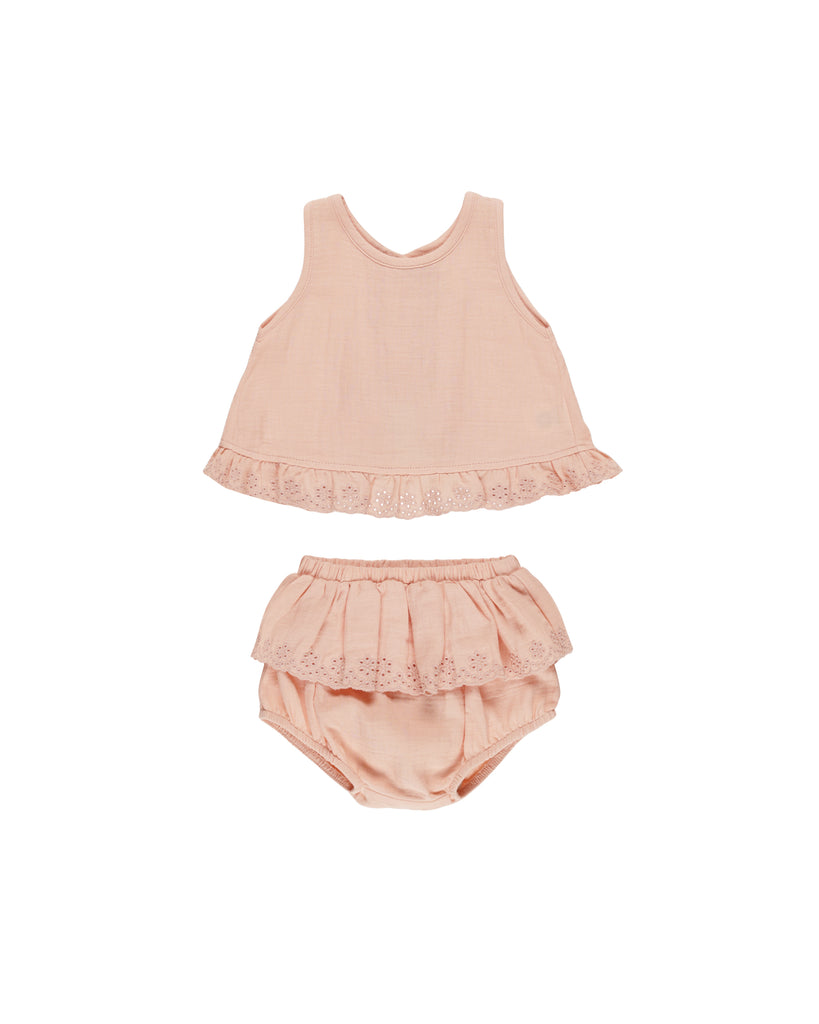 This sleeveless set includes a sleeveless tank with ruffle English embroidery detail Coordinating bloomers have a matching ruffle detail with elastic at openings for the perfect fit.