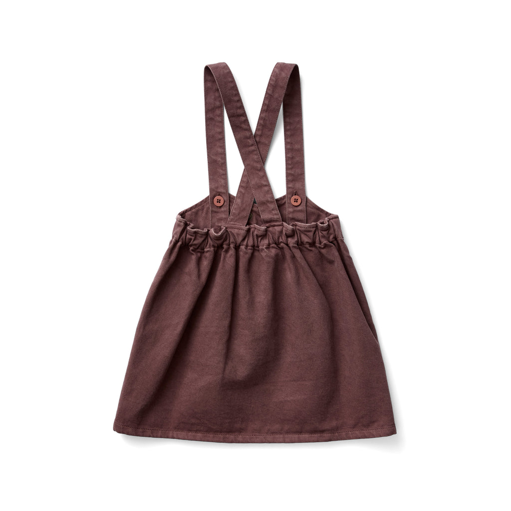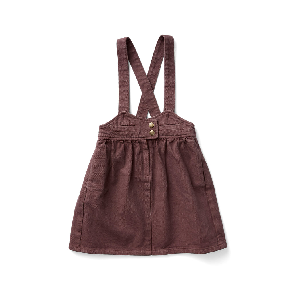 Nostalgic pinafore with shaped yoke and pencil skirt. Double, antique brass snap closure at front opening with hidden zipper. Elastic at back waist, coin pocket detail. Falls mid thigh.