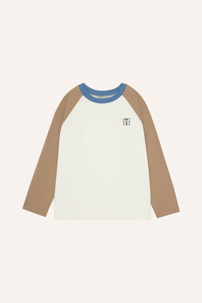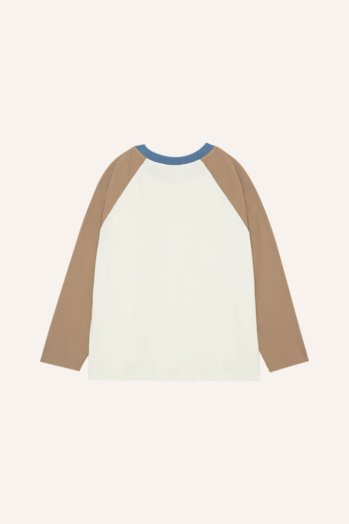 Long sleeve T-Shirt in ecru with sand sleeves ang blue collar for contrast.