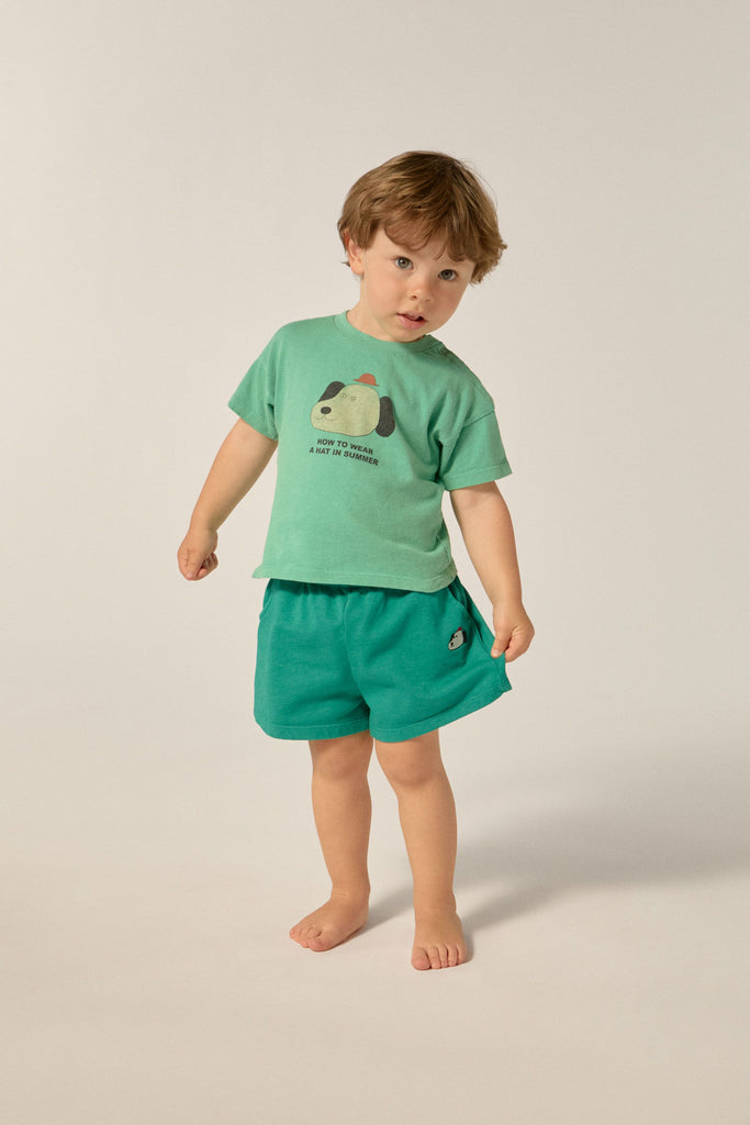Short sleeve T-shirt in green featuring a playful print of a dog wearing a hat, Snap button on collar.
