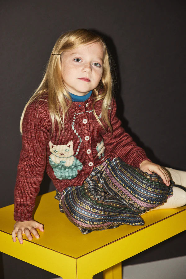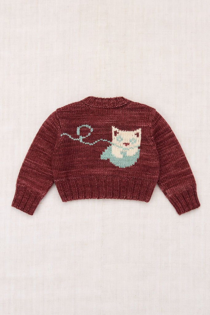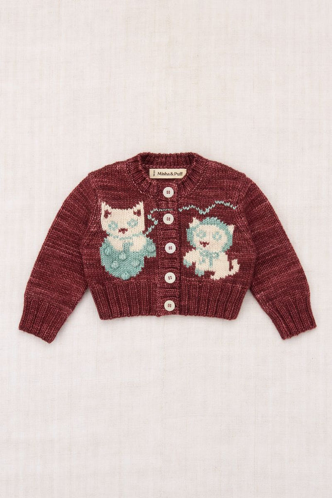 A classic cardigan in Merino wool, featuring a kitten motif intarsia with hand-worked popcorn stitch detail, ribbed trim, and corozo button closure.