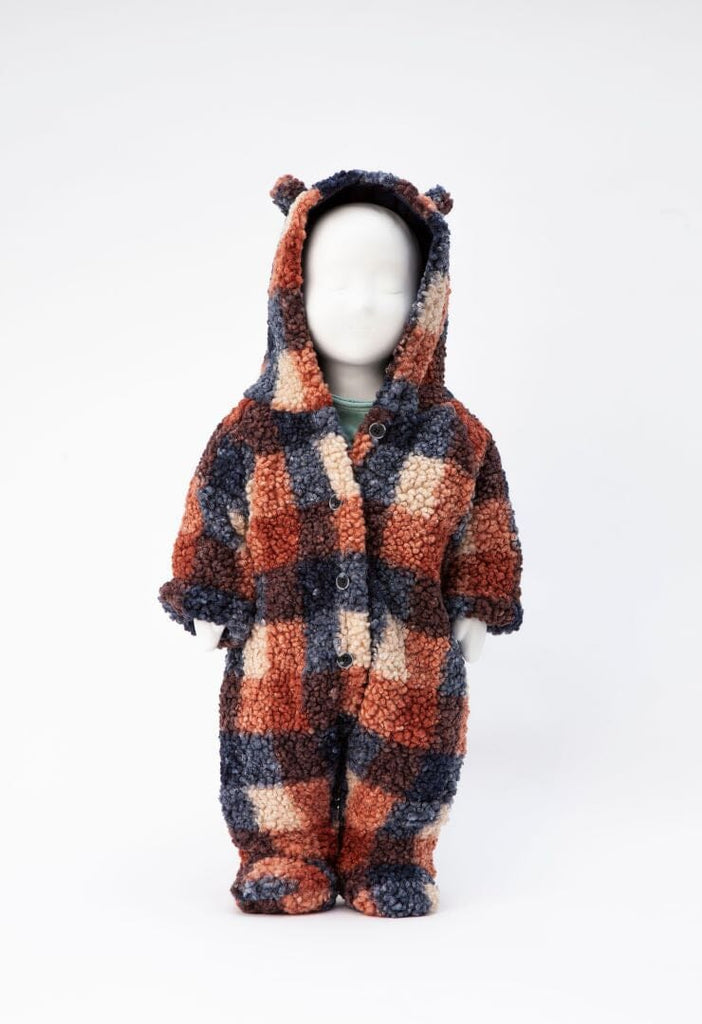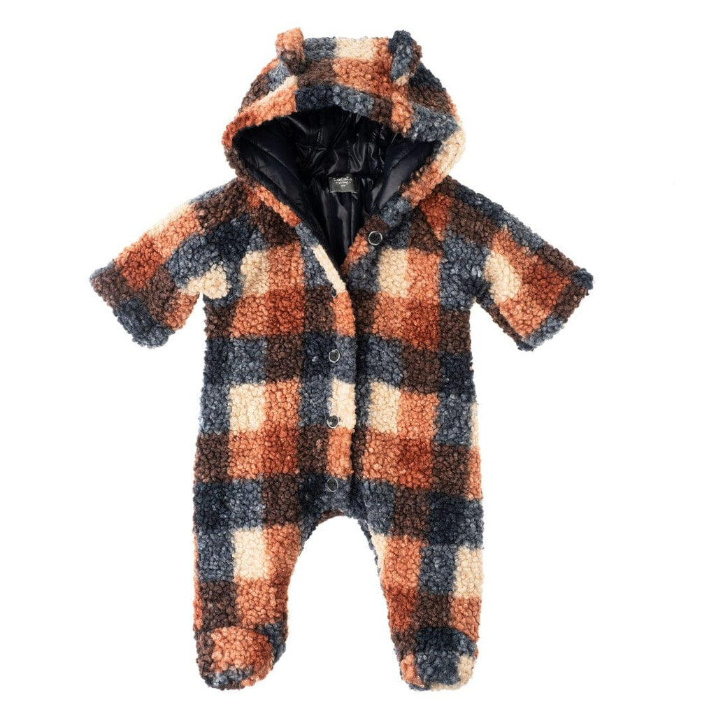 Padded footie jumpsuit with front snaps closure and attached hood.