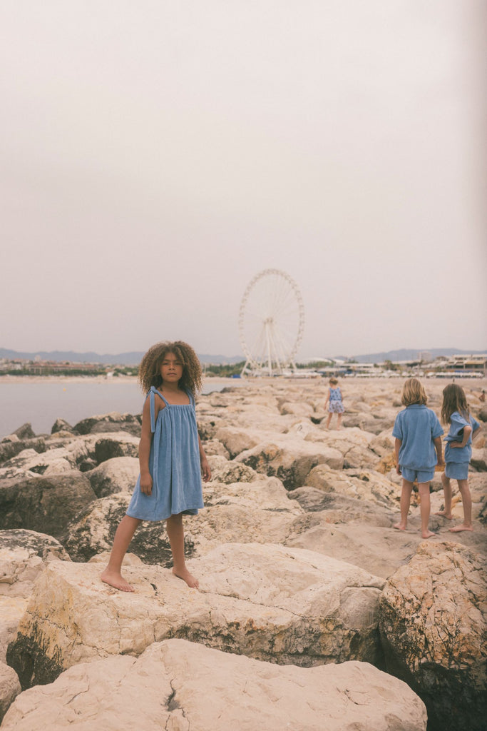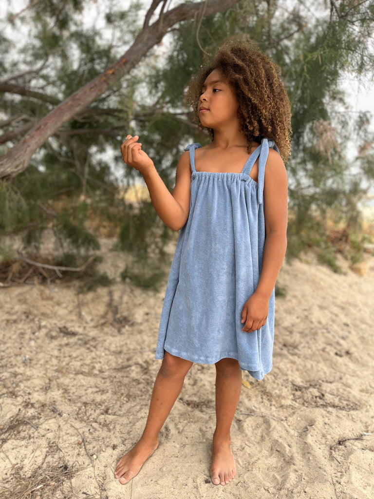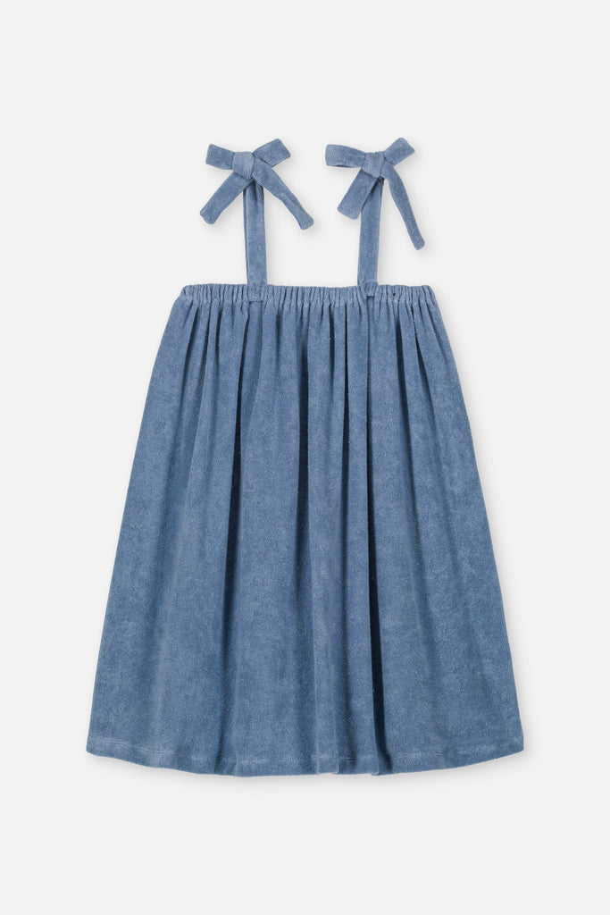 Terry cotton dress with spaghetti bow straps and elastic chest.
